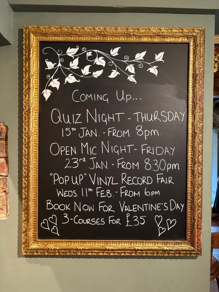 THE | MONTH | AHEAD | AT | THE | OBI There’s lots happening!… QUIZ NIGHT - TOMORROW NIGHT 8pm OPEN MIC NIGHT - Friday 23rd Jan 8.30pm VINYL RECORD FAIR - Wed 11th Feb 6pm Plus…Book Now For Valentine’s Day - Saturday 14th February - 3 Courses for £35 ❤️ Table reservations online or over the phone https://www.barbridgeinn.com/food/ Helen, Jamie and the Team The Olde Barbridge Inn.