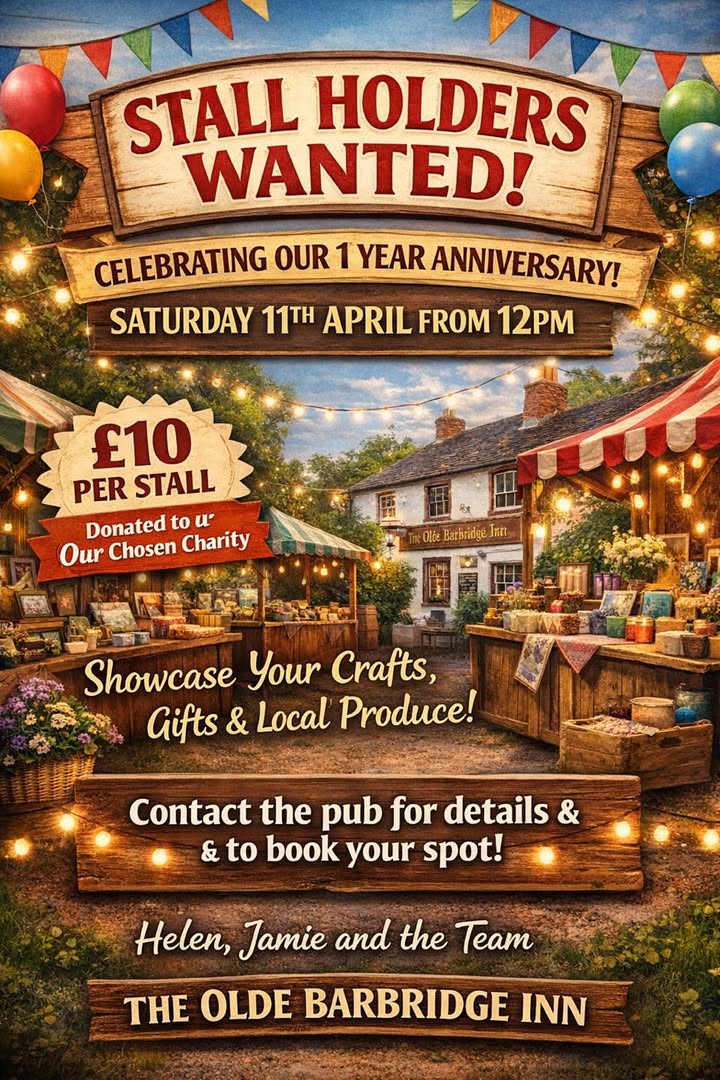 🎉 STALL | HOLDERS | WANTED 🎉 As part of our 1-Year Anniversary celebrations, we’re inviting local stall holders to join us on Saturday 11th April from 12pm at The Olde Barbridge Inn. ✨ Stalls are £10, with all proceeds donated to our chosen charity — so it’s a great chance to showcase your products while supporting a brilliant cause. If you sell crafts, gifts, local produce or something a little different, we’d love to hear from you! 📩 Please contact the pub directly for full details and to secure your stall. Helen, Jamie and the Team The Olde Barbridge Inn 💛