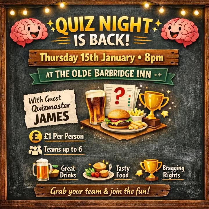 🧠✨ QUIZ NIGHT IS BACK THIS THURSDAY! ✨🧠 Our ever-popular Quiz Night returns to The Olde Barbridge Inn this Thursday 15th January, kicking off at 8pm. We’re thrilled to welcome guest quizmaster James, bringing a brilliant mix of questions, laughs and a little healthy competition along the way. Perfect for a relaxed midweek night out with friends. 💷 £1 per person 👥 Teams of up to 6 📅 Thursday 15th January ⏰ 8pm start 📍 The Olde Barbridge Inn 🍺 Great drinks 🍽️ Delicious food - enjoy a meal before you Quiz! 🏆 Bragging rights very much on the line Get your team together, grab a table and join us for a cracking evening…Everyone welcome! https://www.barbridgeinn.com Helen, Jamie and the Team The Olde Barbridge Inn.