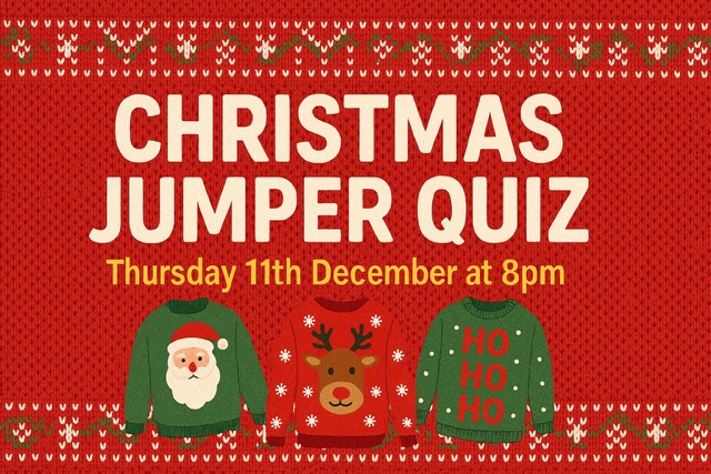 NEXT I THURSDAY It’s Quiz Night…And Christmas Jumper Day! So we thought we’d hold a CHRISTMAS JUMPER QUIZ on the 11th December! We’ll give a point to everyone in a Christmas jumper and prizes for the best…and the worst on the night! Our Quiz will be asking some festive favourites too… So get the date in your diaries and get your team together and jumpers at the ready… See you here at 8pm on the 11th unless you plan to have food before you quiz…Tables can be booked now - online or over the phone. Helen, Jamie and the Team The Olde Barbridge Inn.