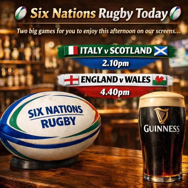 🏉 Six Nations Rugby – Live Today 🏉 Two cracking Six Nations clashes live on our screens this afternoon… 🇮🇹 Italy v Scotland 🏴 | 2.10pm 🏴 England v Wales 🏴 | 4.40pm Big games, great atmosphere and all the rugby action shown in the bar. 🍻🏉 Food available all afternoon too if watching makes you hungry 😂 Helen, Jamie and the Team The Olde Barbridge Inn.