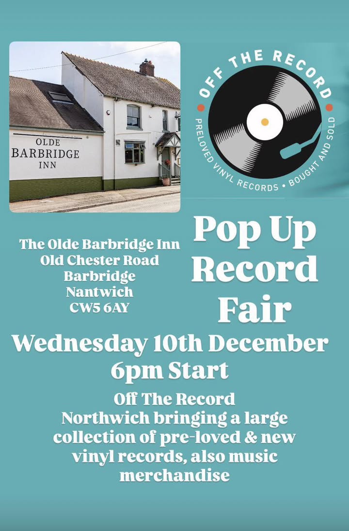 TOMORROW | NIGHT 6pm Our pop up Record Fair hosted by Off The Record starts at 6pm. Come down and search from their large collection of pre-loved and new vinyl records and music merchandise… Should be great fun!…See you here! 😀👍🏻 Helen, Jamie and the Team The Olde Barbridge Inn.